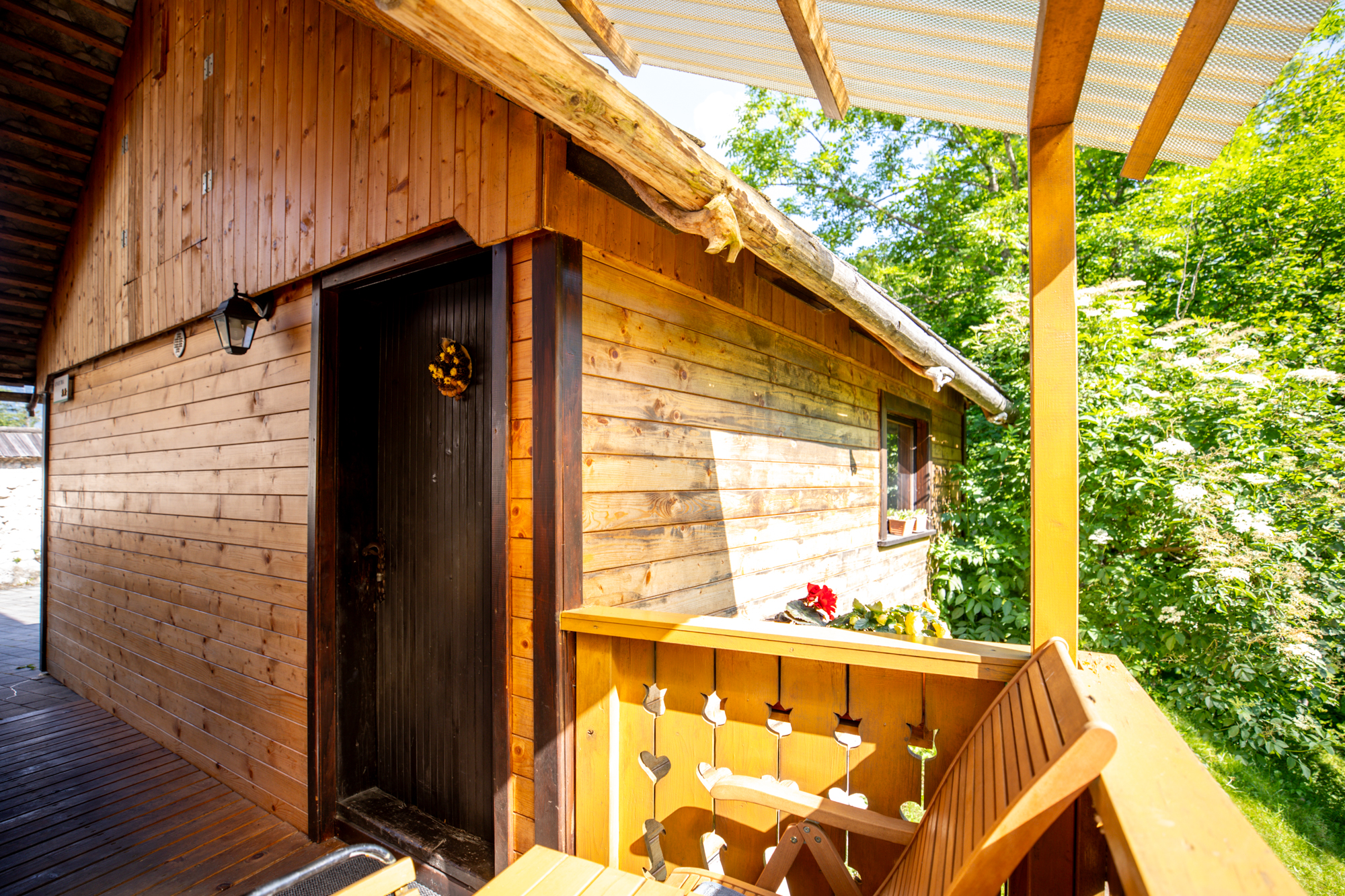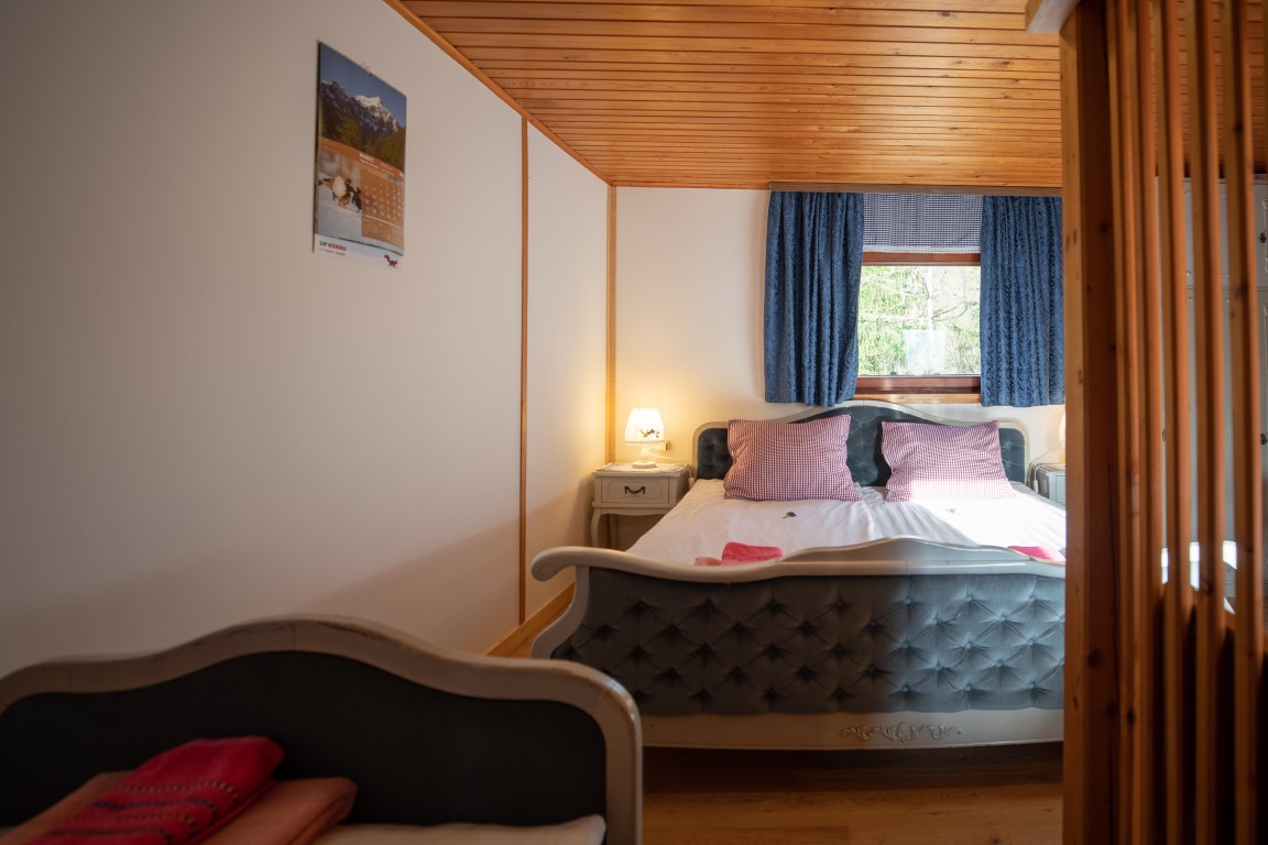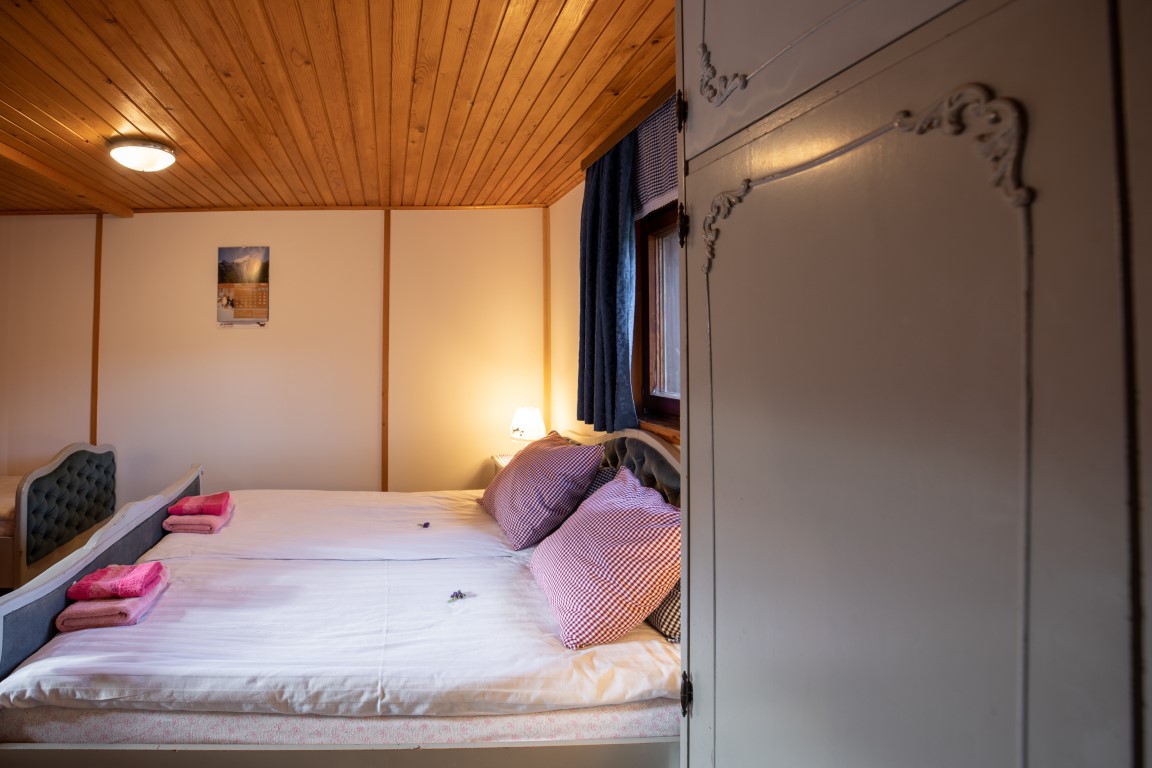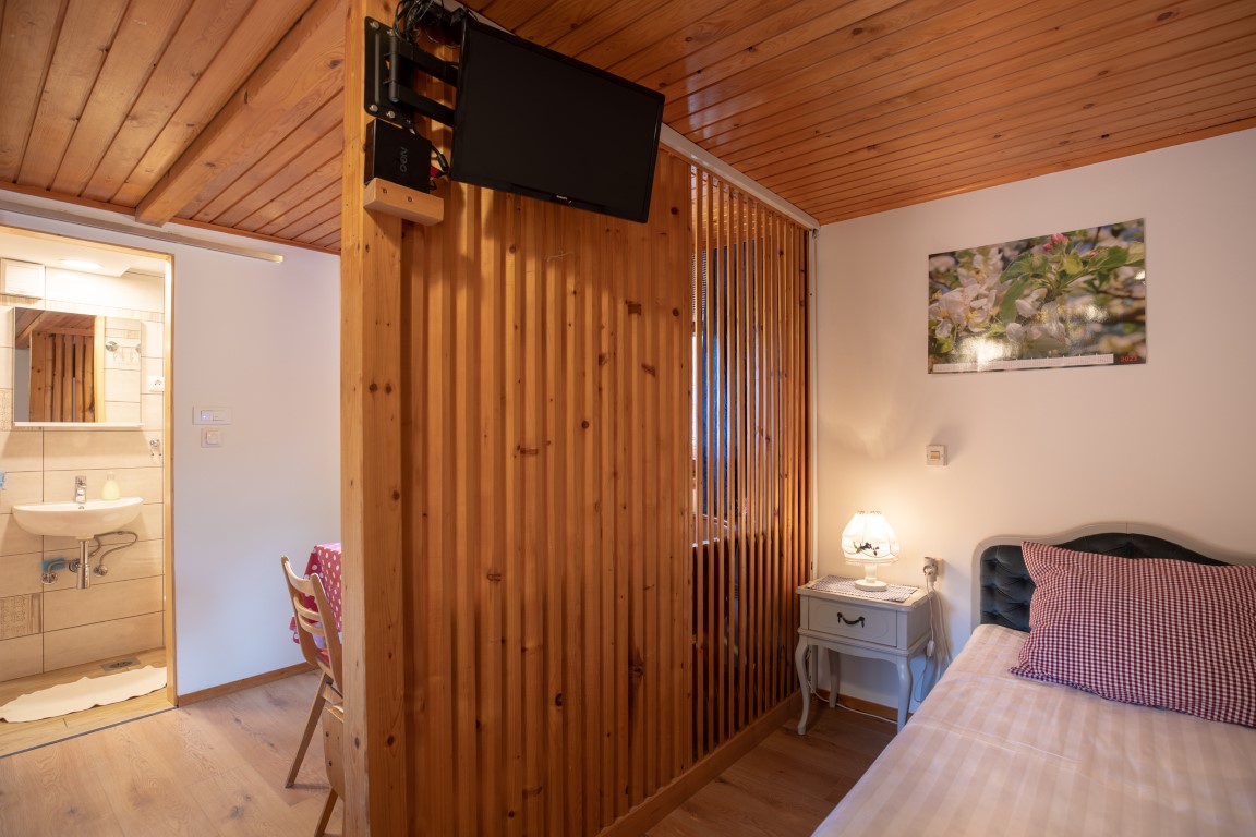 Apartma za 3 osebe je samostojni objekt, ki je dobro opremljen in ima vse, kar potrebujete za prijeten in udoben dopust, vključno s popolnoma opremljeno kuhinjo in lastno kopalnico s prho. Na voljo so tri ležišča, zakonska postelja in ena enojna postelja. Na voljo je tudi terasa, kjer lahko uživate v pogledu na gore in vrt.