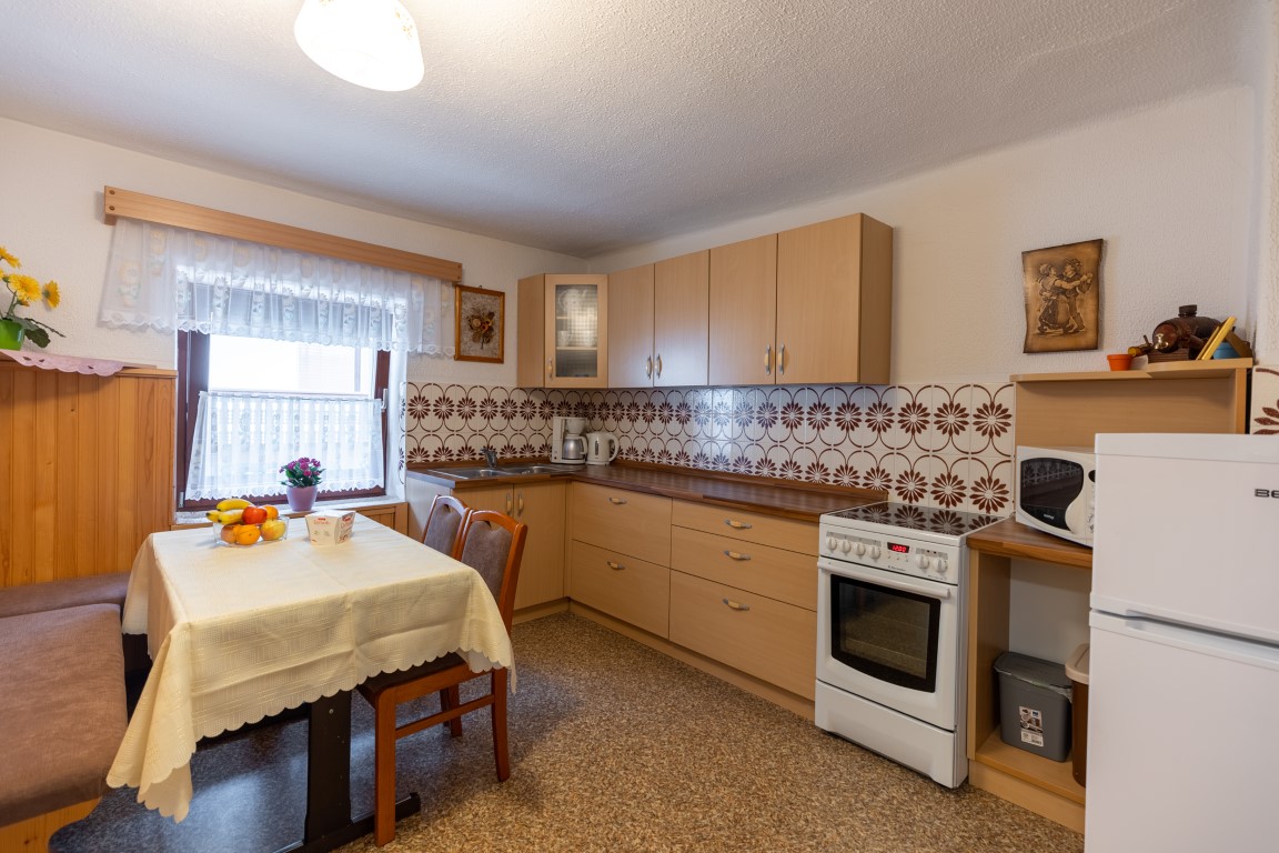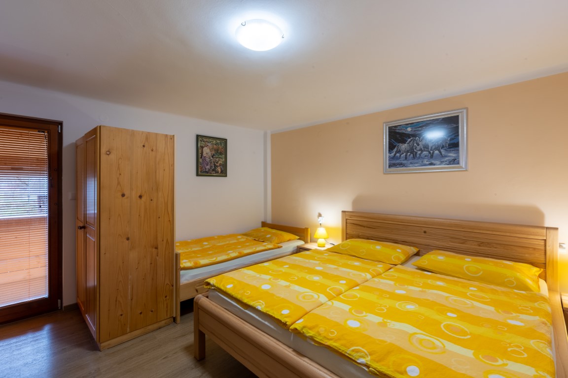 - Apartma z dvema spalnicama je v prvem nadstropju hiše. Ima polno opremljeno kuhinjo (mikrovalovna pečica, aparat za pripravo kave, grelnik vode in hladilnik), dve spalnici (v eni je možnost otroške posteljice), lastno kopalnico s tušem in balkon.