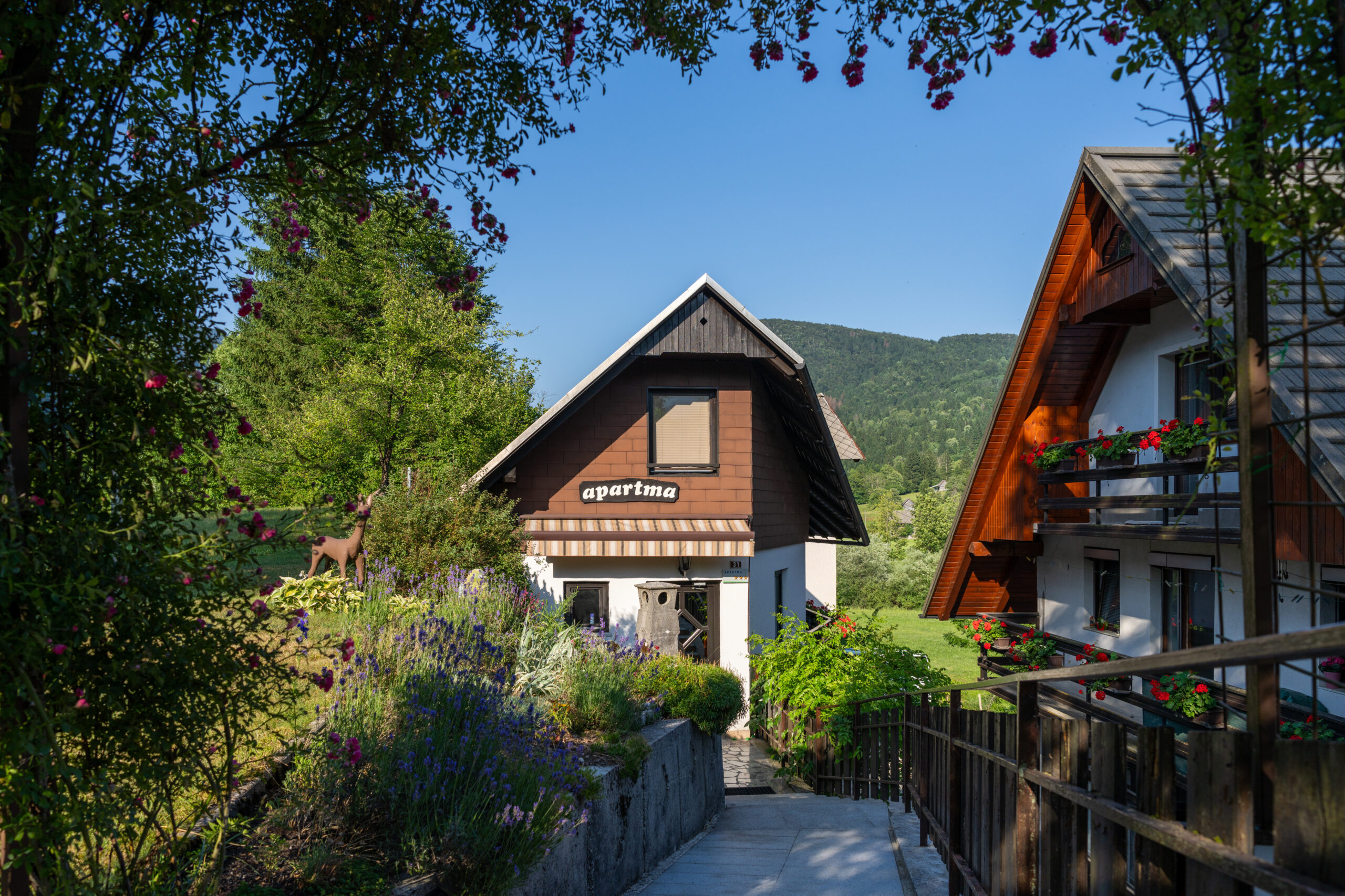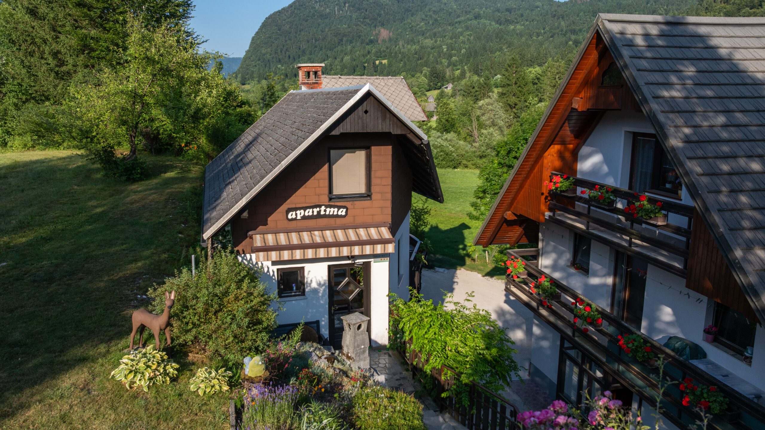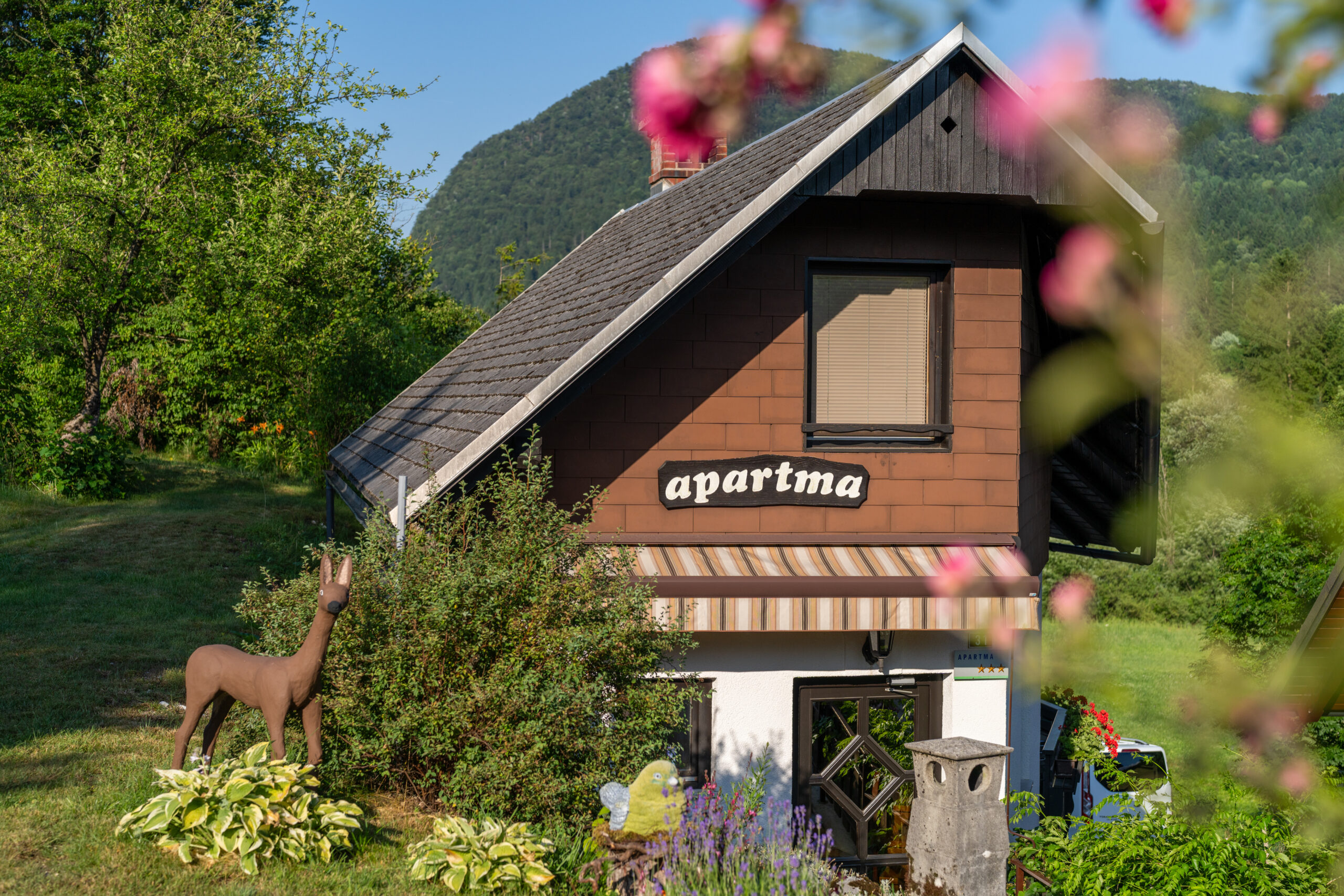 Hišica Pri Srni v mirnem podeželskem okolju, 1 km od Bohinjskega jezera, ponuja nastanitev z brezplačnim brezžičnim internetom in balkon ter teraso s pogledom na gore in vrt.